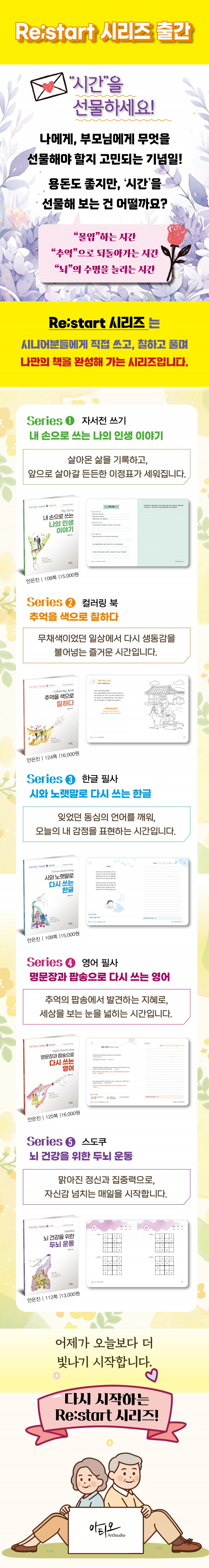Re:Start Series는 시니어를 위한 라이프 가이드북 시리즈로, 삶의 전환점을 맞이한 당신이 ‘나’를 다시 만나고, 다시 발견할 수 있도록 돕습니다. 이 시리즈는 일, 관계, 건강, 취미 등 다양한 주제를 통해 은퇴 이후의 삶을 풍요롭고 의미 있게 설계할 수 있는 영감을 제공합니다.